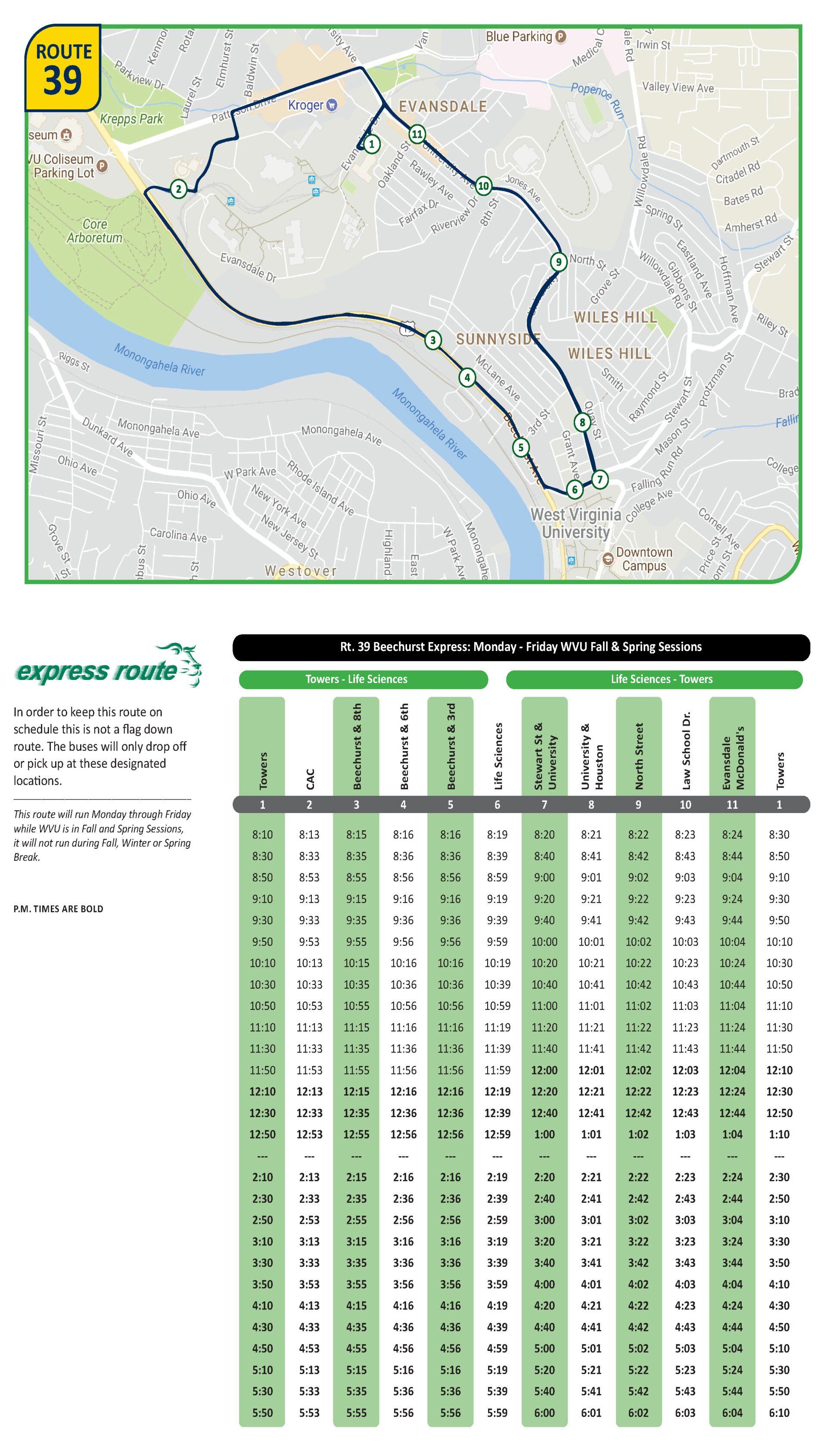 Towers > CAC > Beechurst & 8th > Beechurst & 6th > Beechurst & 3rd > Life Sciences > Stewart St, > University & Overhill > North Street > Law School > Evansdale McDonalds