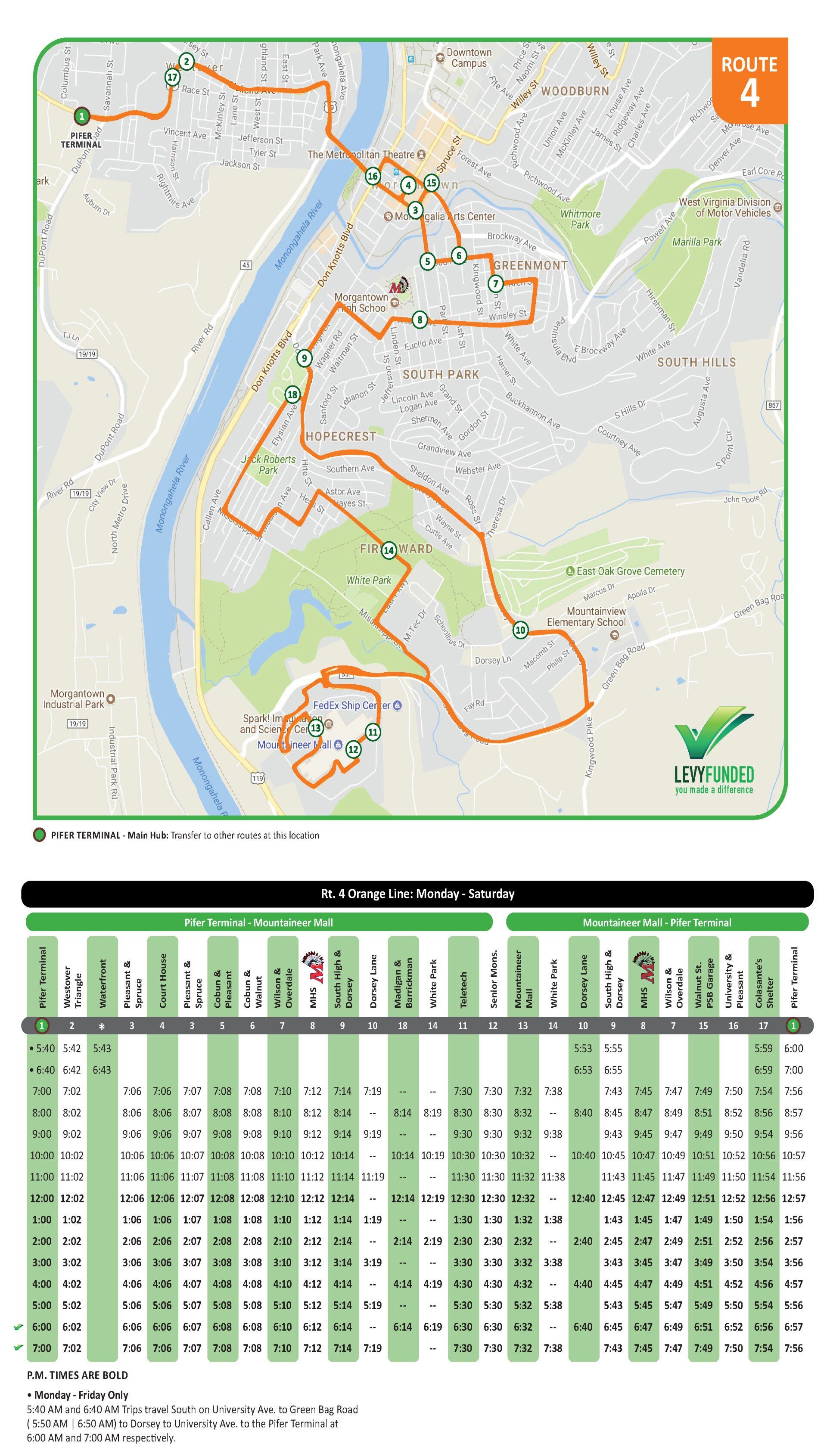 Pifer Terminal > Downtown > South Park > 1st Ward > Morgantown High School > White Park > MTEC > Dorsey Lane > Mountaineer Mall > Senior Monongalians > Giant Eagle > Public Safety > Unity Manor > Court House