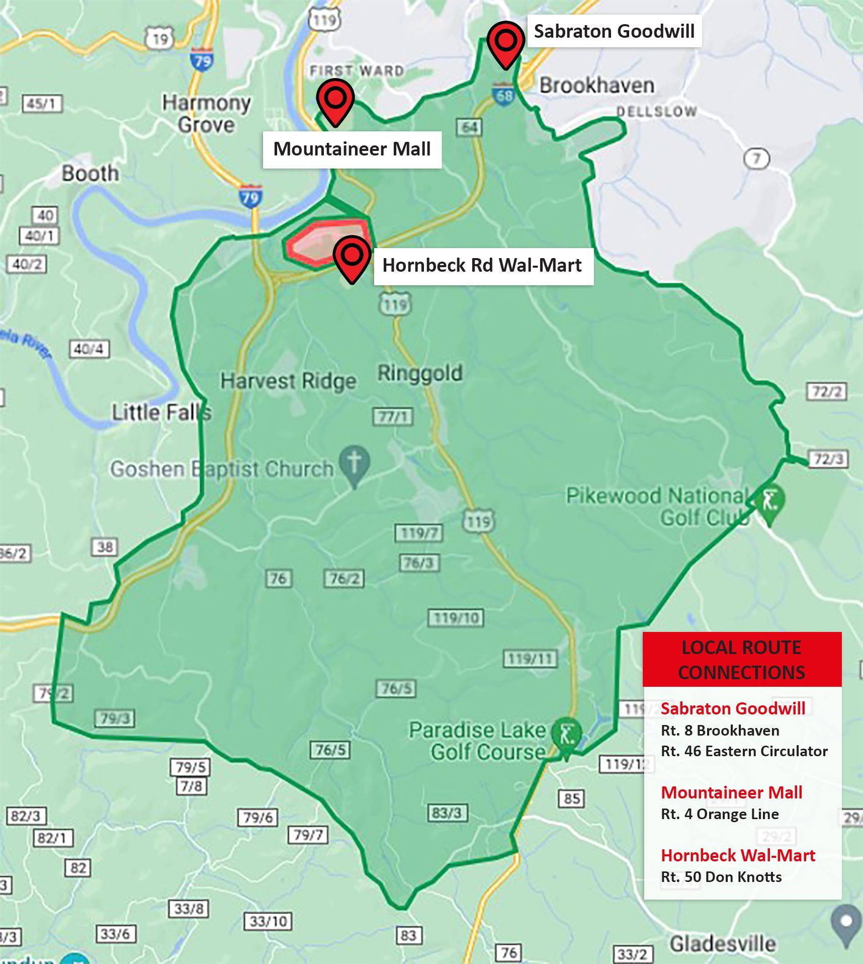 Passengers can request rides live-time without advance reservations and can ride within the service area or be dropped off at one of three designated connection points where they can connect with main line bus routes. The three main travel destinations are Hornbeck Road Walmart, Mountaineer Mall and Sabraton Goodwill.