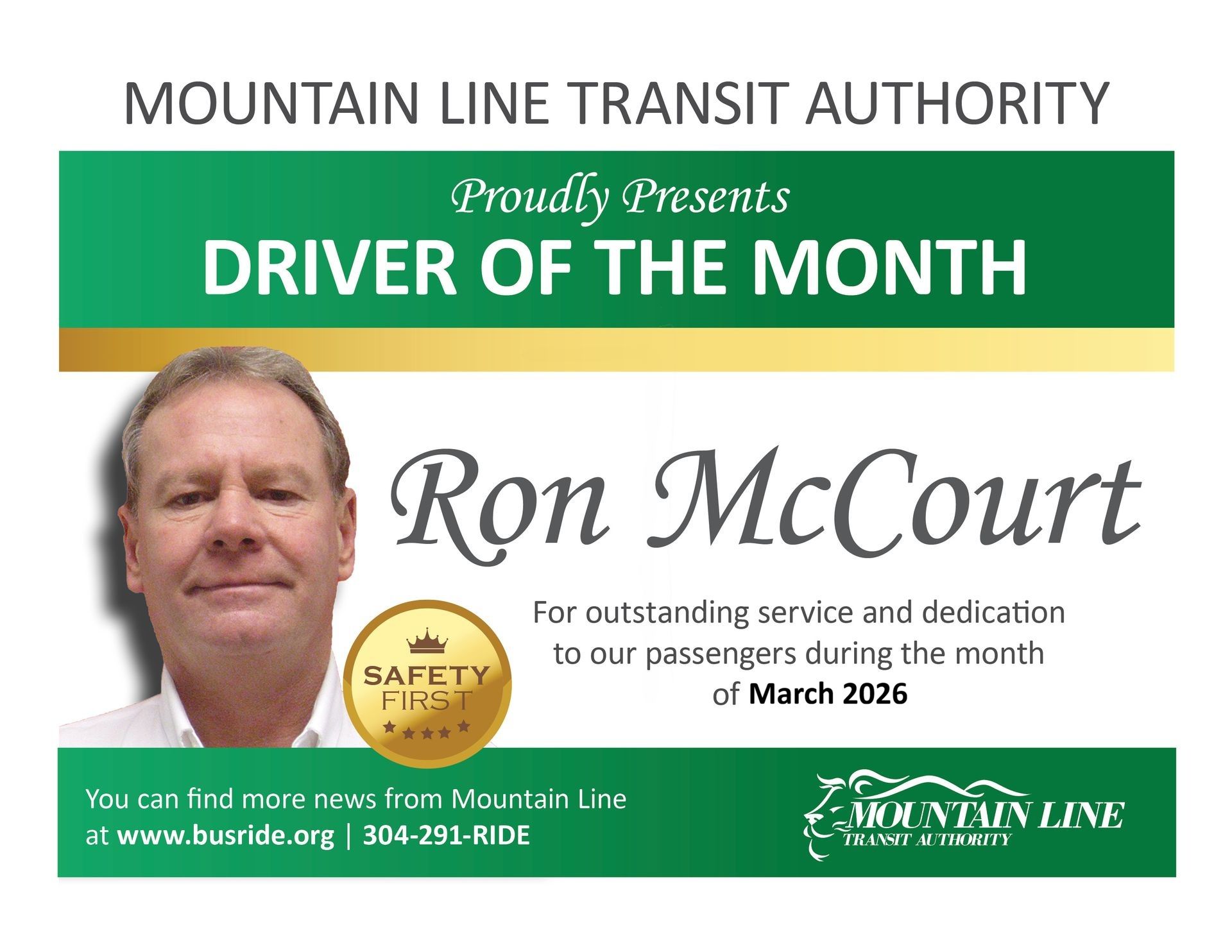 The Mountain Line Transit Authority is pleased to recognize outstanding employee performance for the month of March 2026. After evaluating 56 drivers in 10 performance categories, the Authority is pleased to recognize Ron McCourt as Driver of the Month for March 2026. We also wish to recognize Tom Jones, Shawn Deval, Daniel Shorter and Andrew Kapper. All of these employees are being recognized for their demonstrated driving skills, safety, public relations, assistance to fellow drivers and maintaining route schedules in the course of their daily performance. For more information about the Mountain Line Transit Authority, call 304-291-RIDE (7433) or visit our web page at WW.BUSRIDE.ORG.